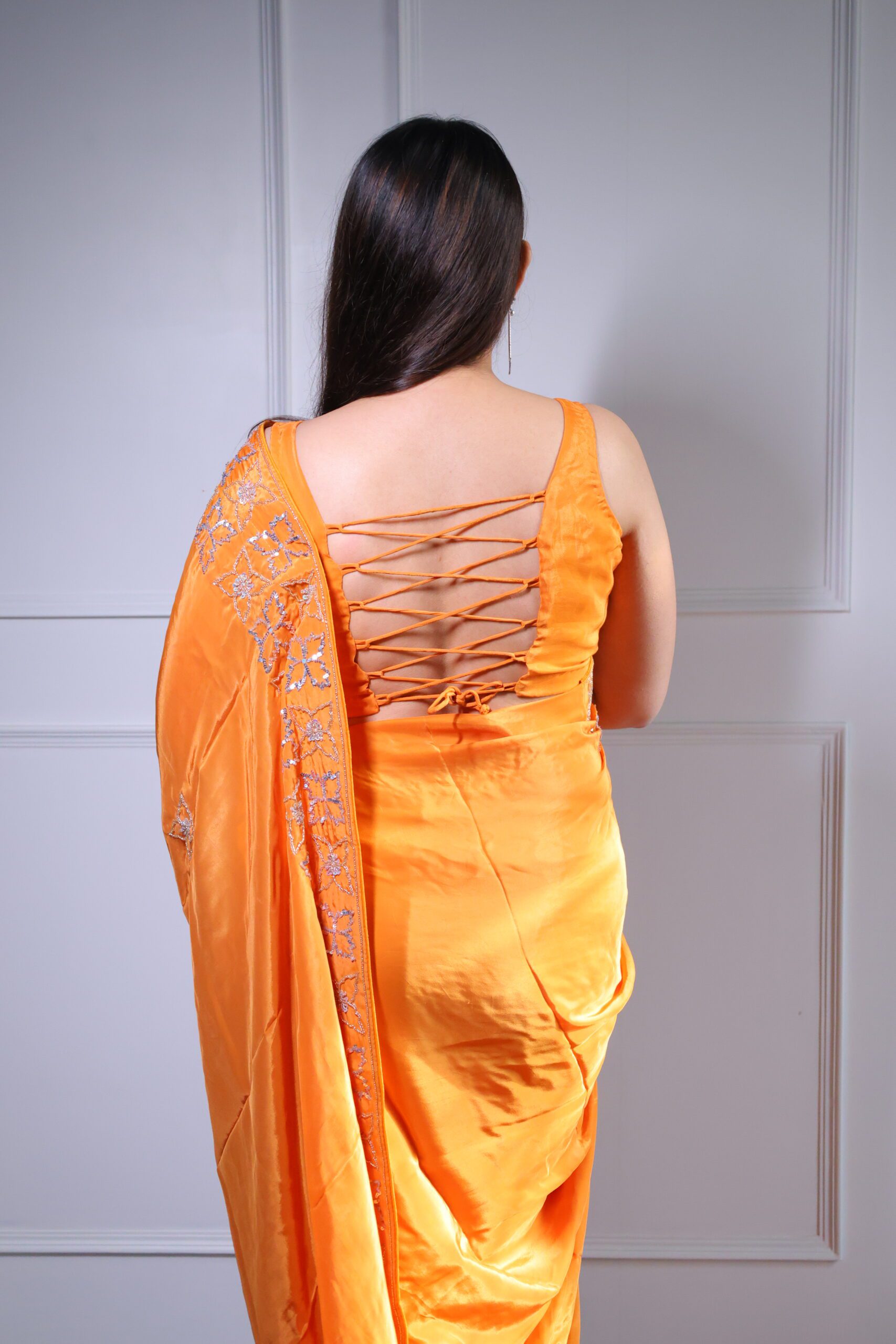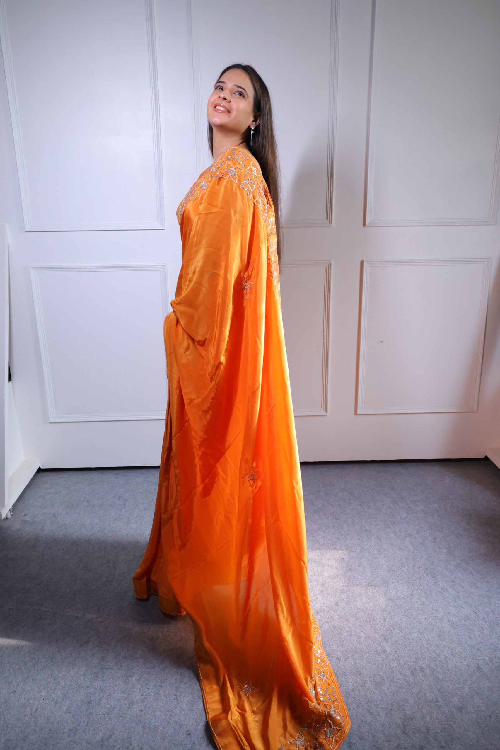 Honey Orange Silk Crepe Saree is a delightful blend of elegance and art. The warm orange-honey shade is perfect for creating a sophisticated and radiant look. The crepe fabric of lightweight silk fabric drapes effortlessly, offering a flattering silhouette for each type of body. Improved with intricate hand embroidery, this saree is ideal for parties, festive meetings, or evening events. With its refined mastery, it embodies the timeless charm of Indian fashion.