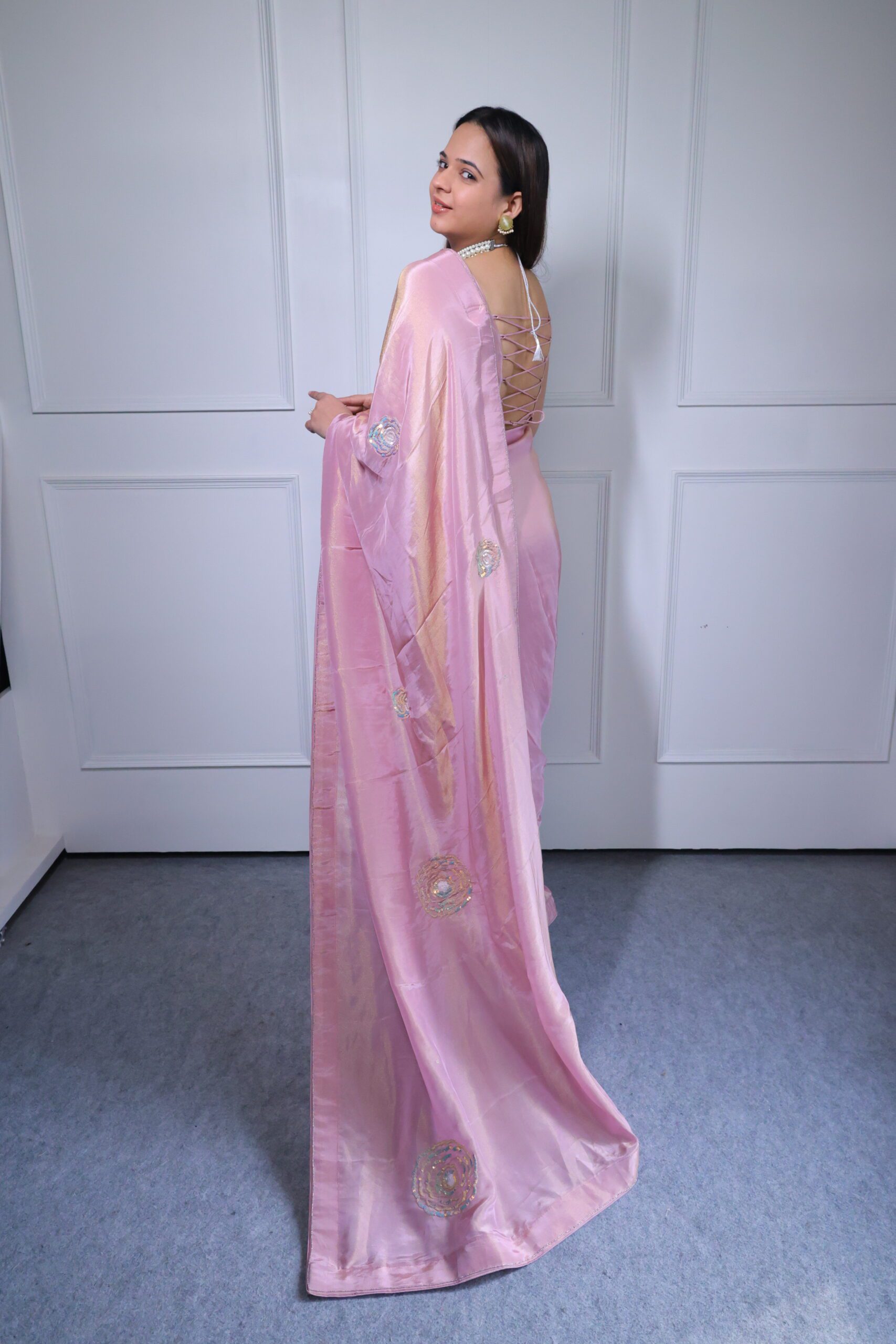 The Rani Pink Silk Tissue Saree is a mix of tradition and glamour. The vibrant pink shade is beautifully complemented by the rich texture of silk tissue fabric. Hand embroidery adds a note of elegance, which makes it perfect for festive meetings, weddings or evening parties. This saree is lightweight, easy to drape, and ensures brilliance with grace and sophistication.